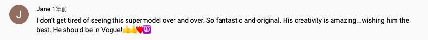 我看这位名模的视频根本看不厌,又奇妙又有趣,他的创造力也令人惊叹...他应该登上《Vogue》。