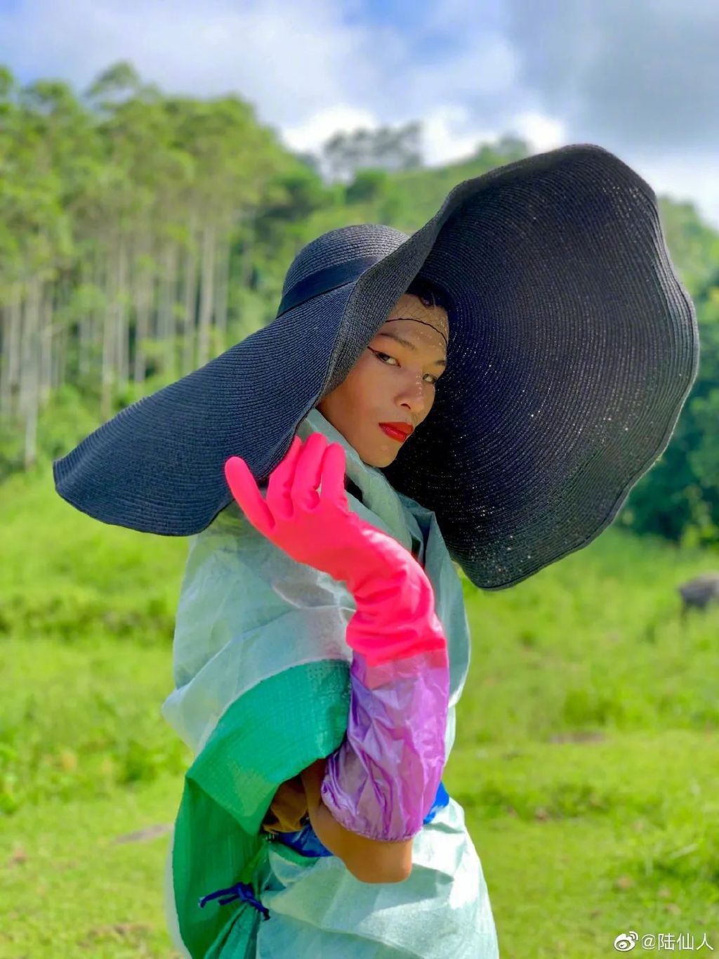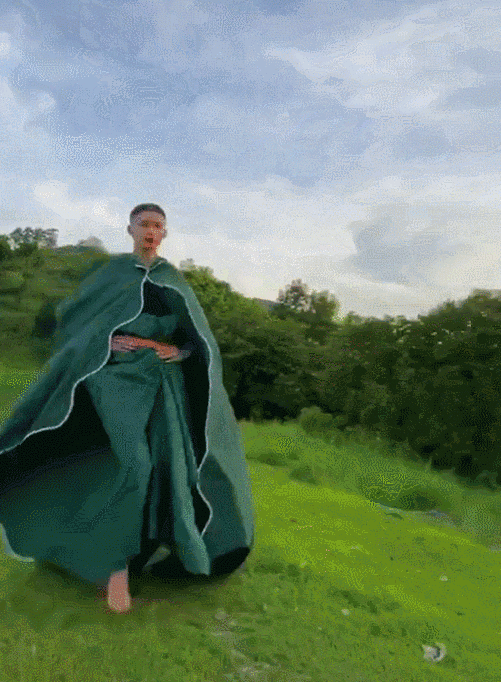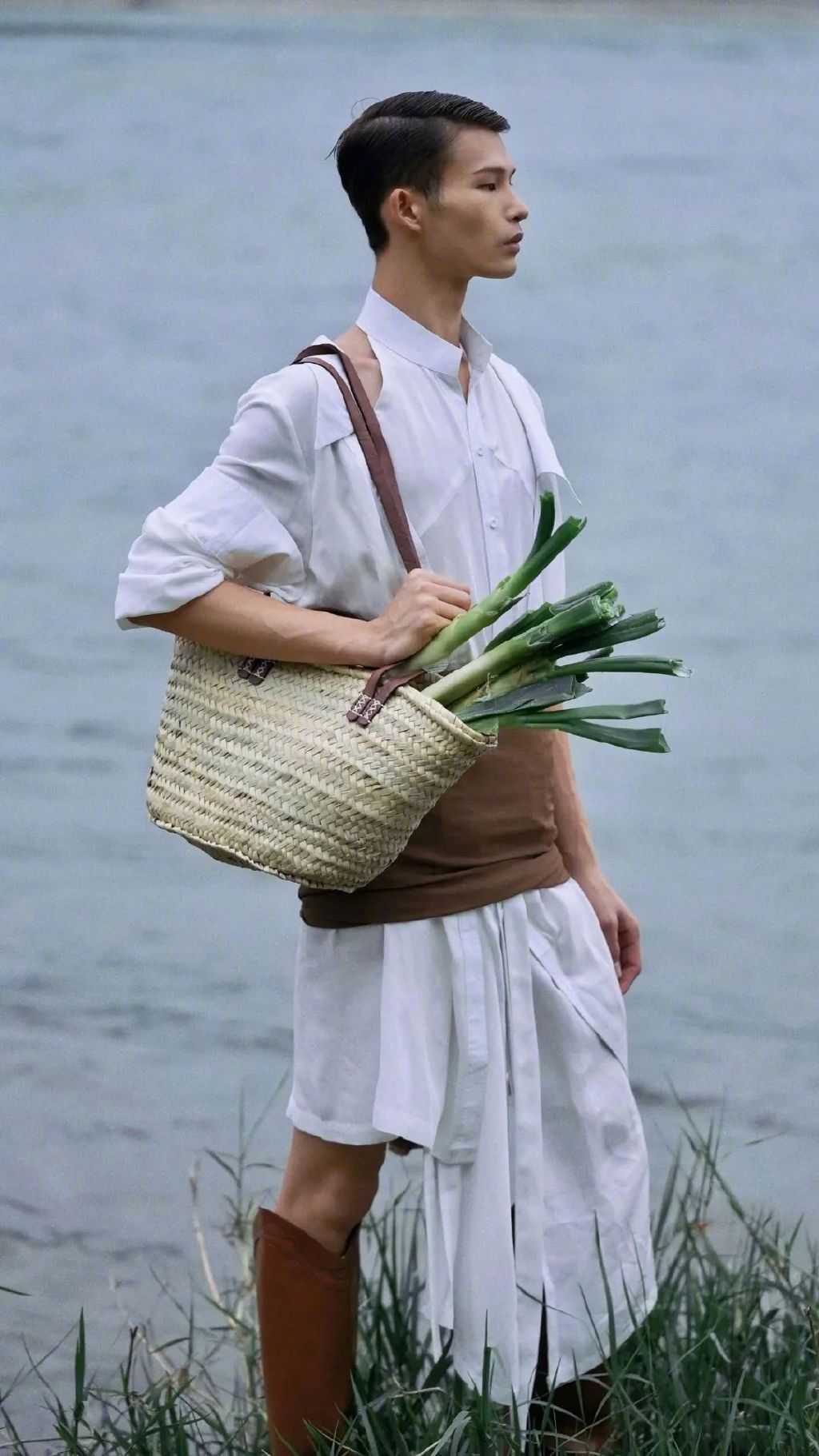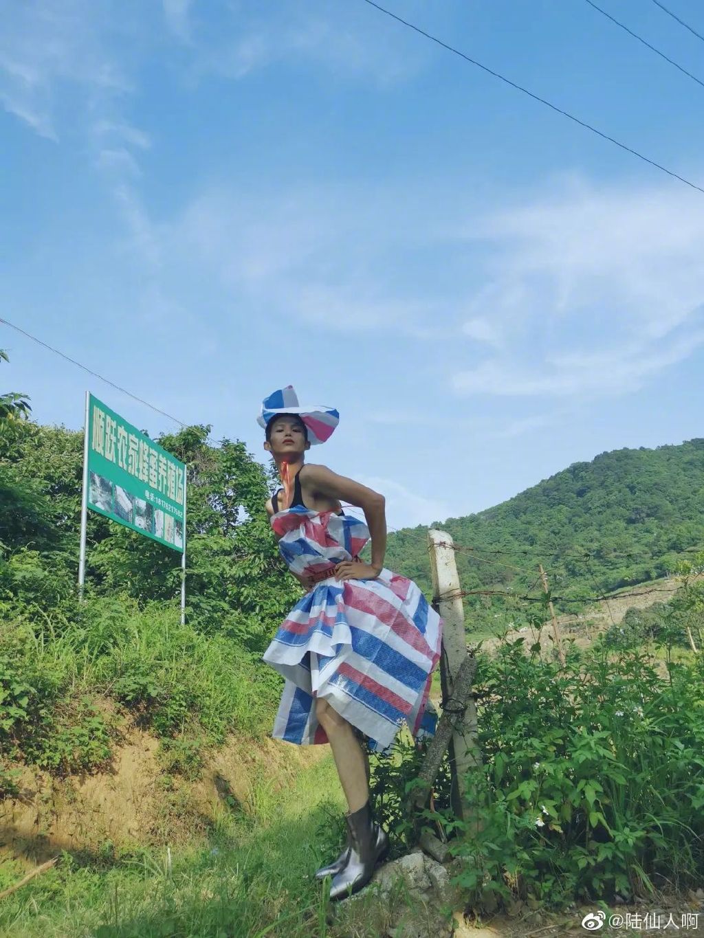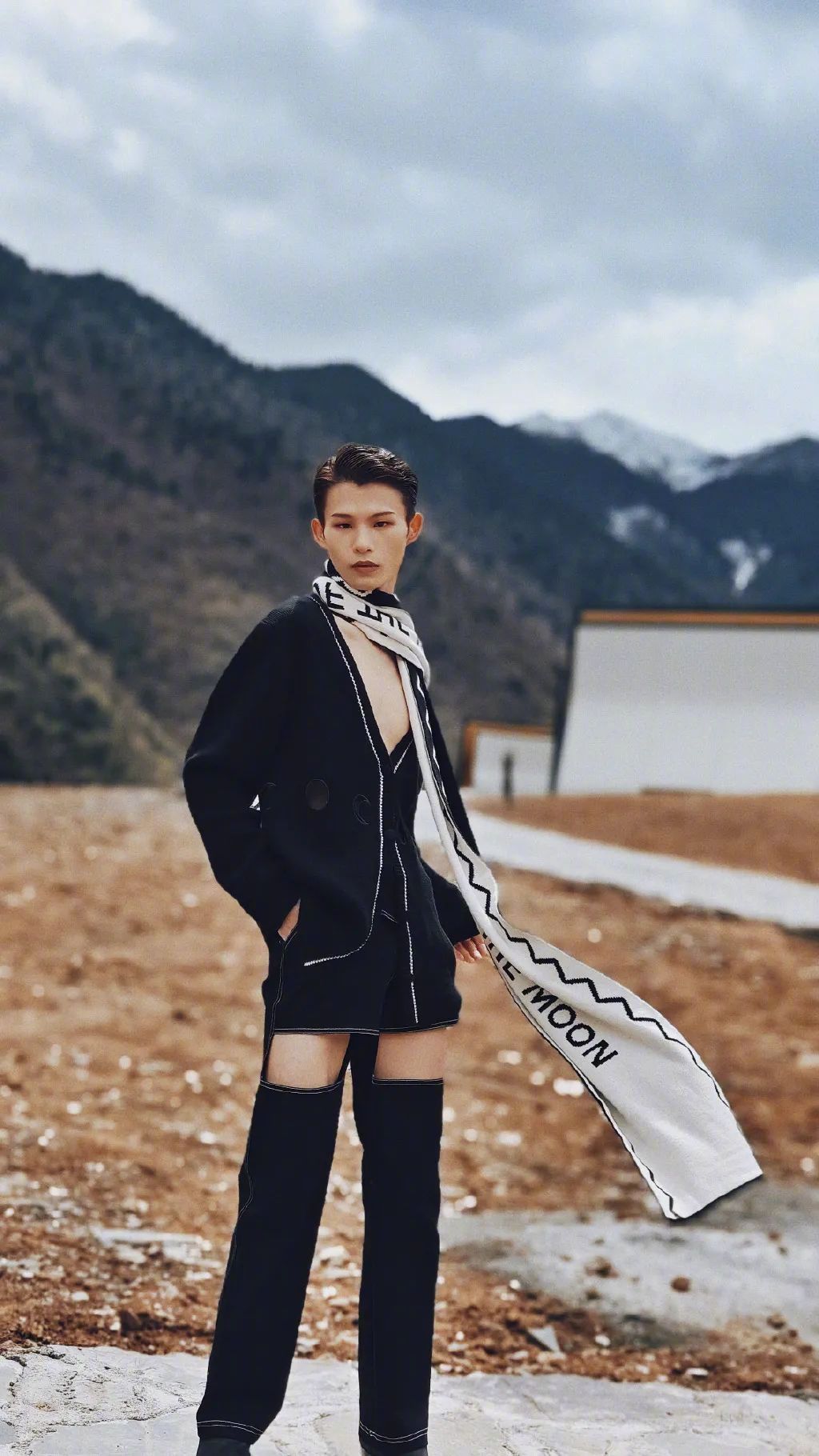 在没有任何专业训练的情况下,自己研究练习表情管理、台步、定点;外加上老天爷赏饭般的身材比例和由内而外的自信气质让人移不开眼,即使在田间田间或是空旷产房,即使他身上披着的是自制的衣服,依然展现出满满的高级感: