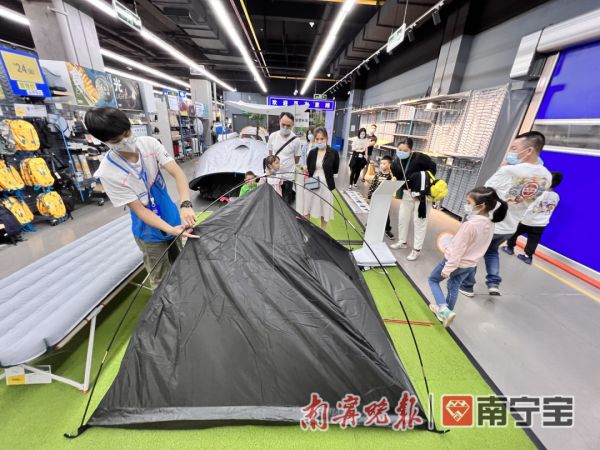 街坊在室外运动店里购买帐蓬、浅坑等野餐用品