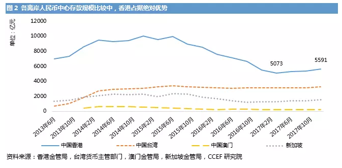 作为CNH服务中心,香港凭借着独有的区位和中国经济地位,累积了数量众多的中资银行金融政府机构,也成为了国内外资金来往、对外贸易来往、人员来往的中转。2004年2月,香港全境银行便准许办理手续部份港币销售业务,2018年1月,香港经营港币销售业务的许可证政府机构就达到了138家,港币银行服务相当普遍。和其他的港币CNH服务中心相比,香港的港币金融产品服务齐备,从银行存款、债券、基金、股票到保险业务应有尽有,股权投资女团方式多样化。以银行存款体量为例,2017年底香港的CNH港币银行存款为5591.37亿元,超过台湾地区、香港、马来西亚CNH港币银行存款之和。