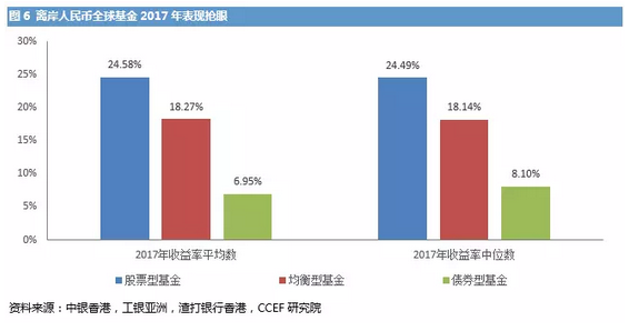 香港的普通股权投资者可以接触到以公募基金、ETF等形式交易的RQFII产品,透过股权投资RQFII进入内地资本消费市场。由于2017年明显的股债消费市场分化行情,最近一年,在境内外以港币形式认购的RQFII基金呈明显收益分化格局。偏股型基金表现优异,股票型与混合型基金平均收益率为18.93%,中位收益率为19.37%;而偏债型基金收益惨淡,债券型和货币型基金平均收益率为1.21%,中位收益率为1.29%。利用近似可比的数据,2017年全年内地对外开放式基金中股票型基金平均收益率为14.29%,债券型基金为2.37%。