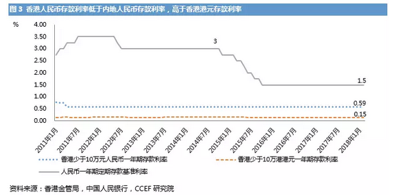 在香港消费市场,与本币银行存款一样,港币银行存款同样得到银行存款保障计划的保障,截至2018年2月,共有151家银行成为银行存款保障计划的成员,这些银行每位银行存款人的常见银行存款账户可享受50万港元以内的全额保障。从收益来看,由于香港实行联系人民币汇率制,港元利率紧随美元利率而动,香港港币银行存款利率高于同期港元银行存款;但又由于CNH港币使用范围的局限,香港全境银行经营港币银行存款获利空间有限,香港港币银行存款利率远低于同期内地港币银行存款(图3)。香港各主要银行普通银行存款利率差别不大,但银行对利率的自主调节十分灵活,银行可以对特定范围的银行存款给出特惠利率以吸引银行存款,如大新银行、渣打银行等就对新客户一定数额以上的港币一年期定期银行存款给出了近4%的特惠年利率。