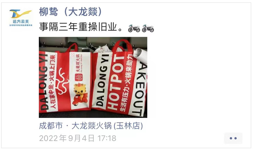 9月4日,餐饮业新连锁店在贴文看到:小龙燚副董事长柳鸷开始特地送送餐了。