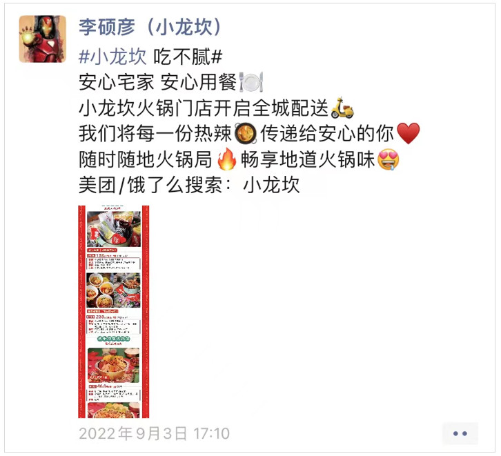 紧接着,万勇超排骨、小龙燚排骨、李不管餐饮业等品牌,以抚慰消费者情绪的方式,紧锣密鼓地推进线上的各类送餐。