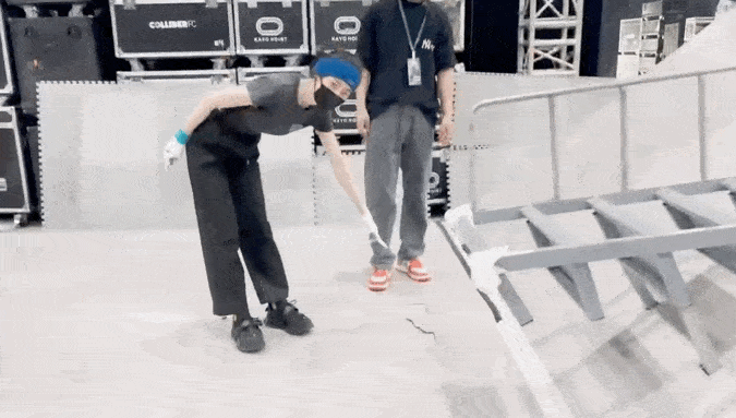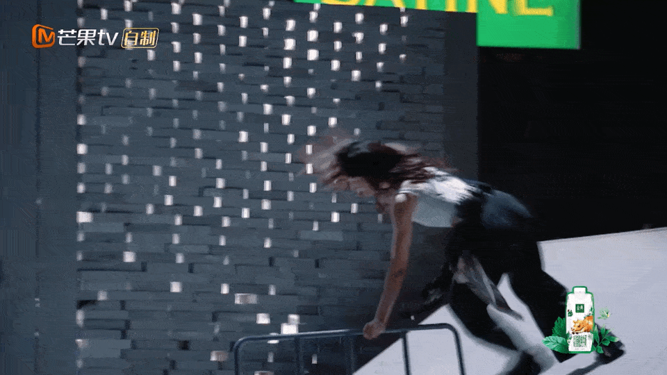 为了完成舞台上的侧翻,练习时候她间接将地板踩烂↓