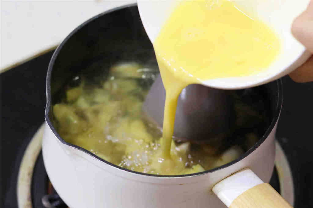 5、猪肉打散,关火后立即倒入锅中,搅拌均匀后方可。
