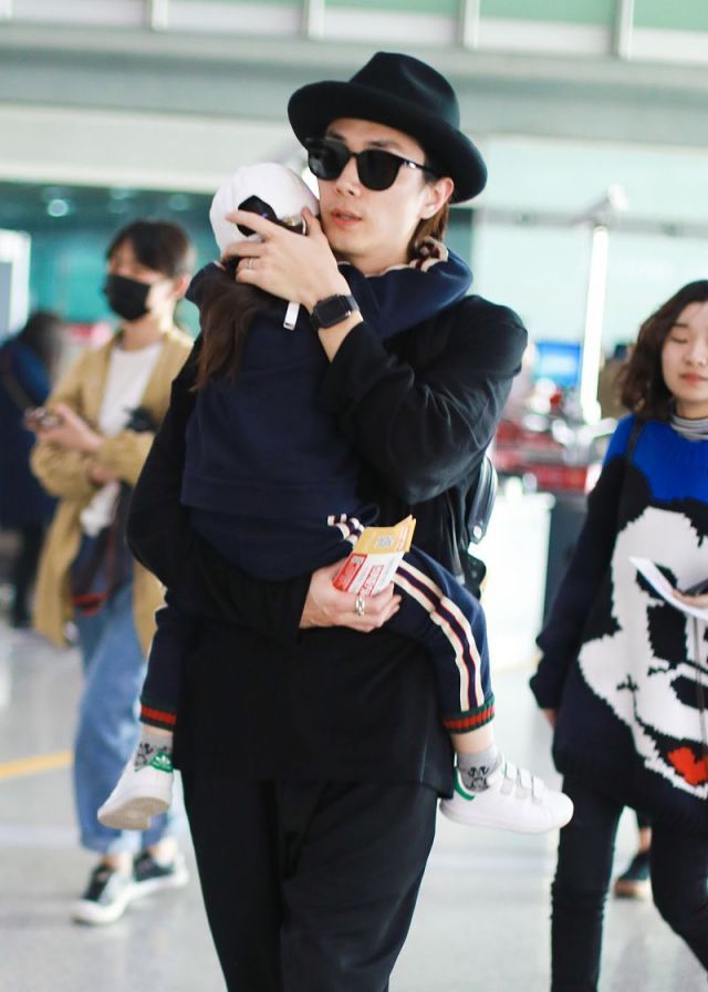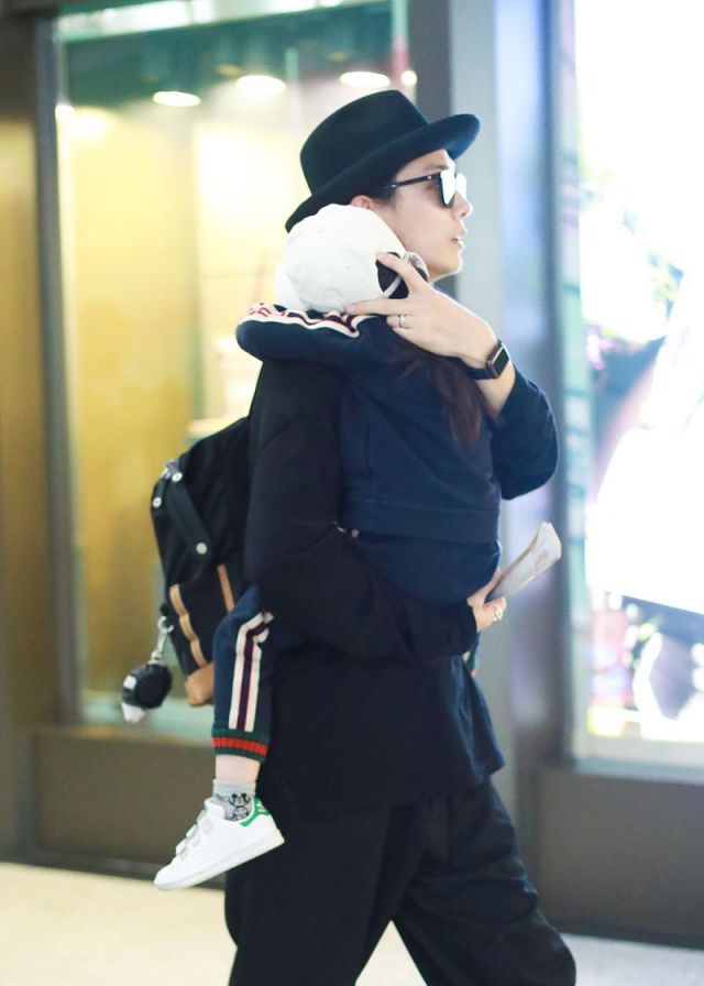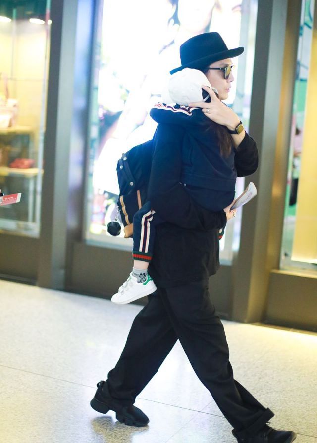 儿子Lucky也是潮装打扮,戴帽子扎马尾背影呆萌,趴妈妈肩上乖巧温顺好似鹿霍,父女合体亮相画面温馨有爱。