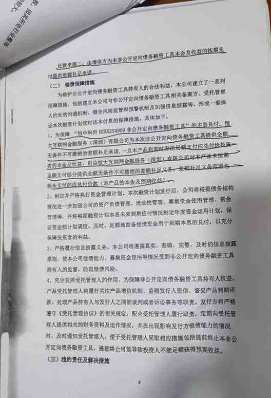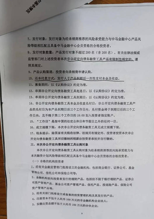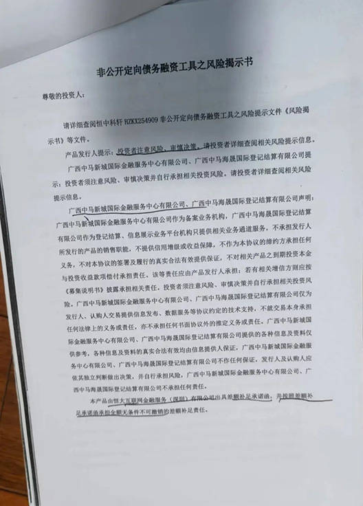 虽然投资前,有投资投资理财风险提示,但让李女士敢于这样下大血本的是风险提示上的还本付息方式承诺,其上白纸黑字地写着:发行人于产品到期后一次性支付本金及收益,偿付期为产品到期日后三个工作日内,且不晚于第三个工作日的18:00。若发行人未按期足额向投资者偿付,每欠费一日,应按欠费金额的万分之三向投资者支付违约金。还款来源之一:发行人经营活动及与其相关的投资业务中所产生的收入直接用于归还非公开定向债务融资工具各期应偿付本金及收益。还款来源之二:由增信方为非公开定向债务融资工具本金及收益的按期偿付提供差额补足承诺。
