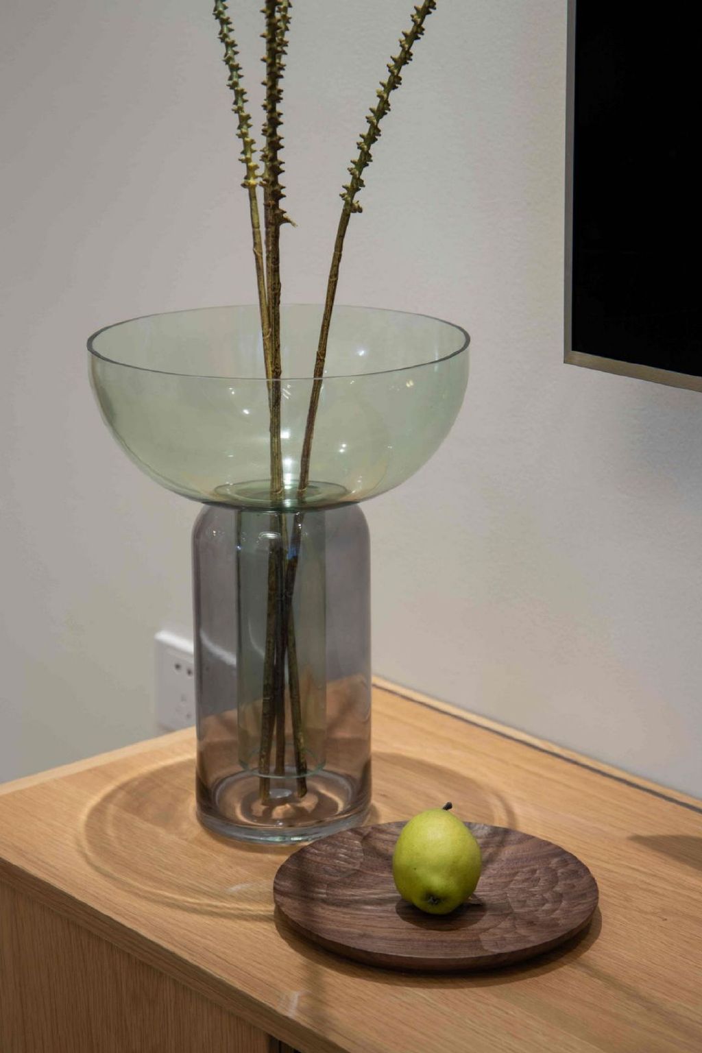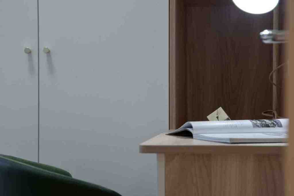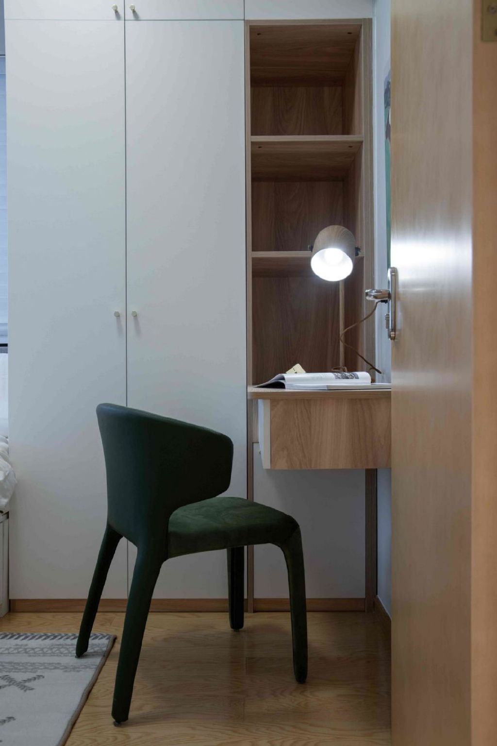 小巧地悬空书桌搭配绿色的丝绒凳子,让内部空间散发着一种独特的时尚和摩登气息。