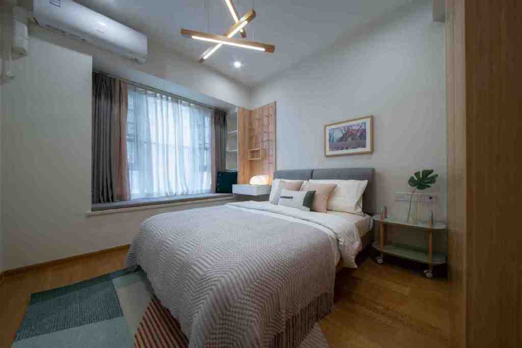 窗外的阳光折射到室内,让卧室也变得更为柔和。