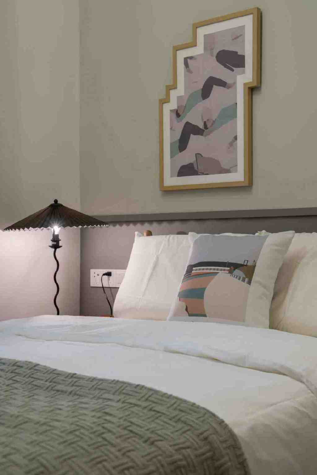 不对称的床头灯起到了很好的烘托效果,让整个内部空间散发着一种别样的气质。
