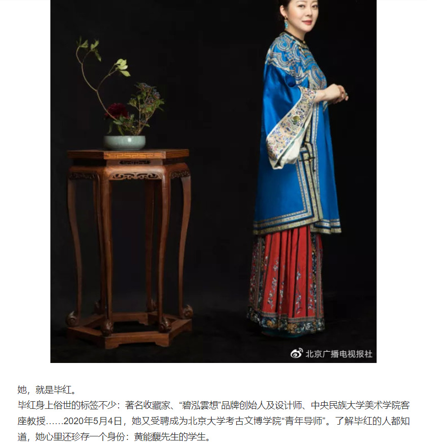 在这篇报道中,称毕红是著名收藏家、碧泓雲想品牌创始人及设计师、中央民族大学美术学院客座教授……