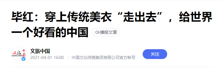 次日即2021年4月1日,中国文化传媒集团有限公司官方帐号文旅中国正式发布专题报道《毕红:穿上传统美衣走出去,给当今世界两个好看的中国》。报道中也称毕红是古典美衣收藏家、上海工艺美术大师毕红。