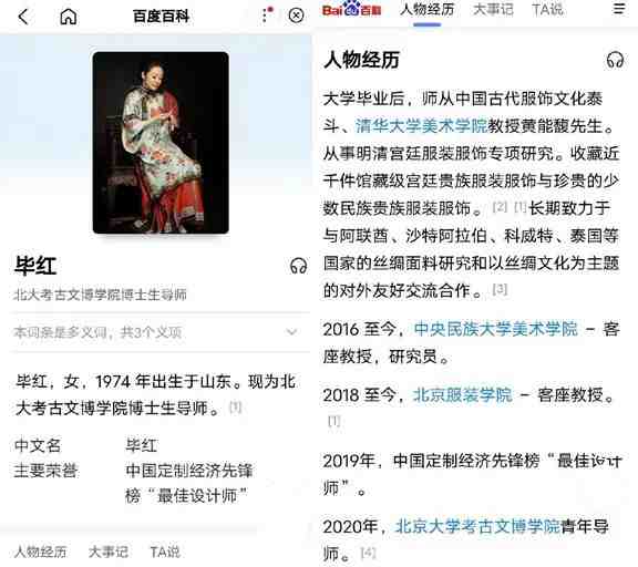 然后,在昨天极其诡异的事就发生了:毕红的百度百科突然就变了,在新的百度百科里,毕红的是上海大学考古文博学院的博士生导师、中央民族大学美术学院客座教授、研究员,上海服装学院客座教授及是中国古代服饰文化泰斗、清华大学美术学院教授黄能馥的学生等内容被悉数删掉了。甚至于连她获得的那个所谓的中国定制经济先锋榜最佳设计师大奖也删掉了。