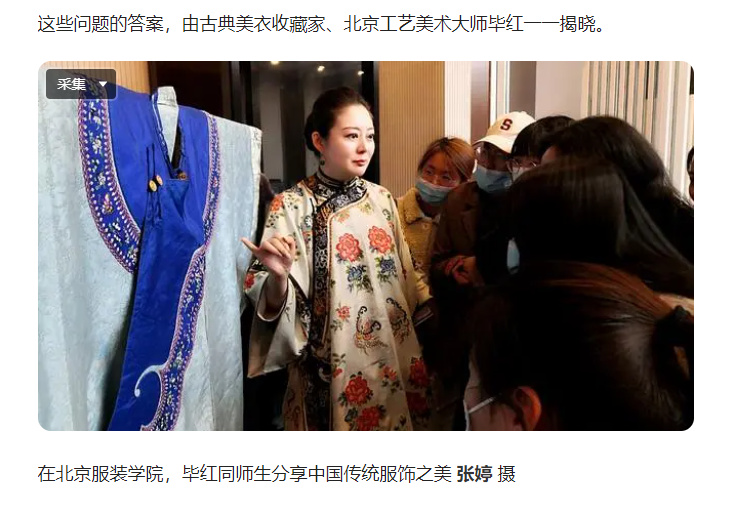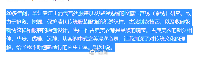 报道中称20多年间,毕红专注于清代宫廷服装......反正说的是相当的高大上。