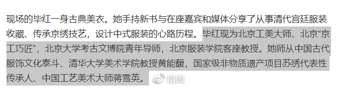 报道强调了毕红的另两个身份是黄能馥先生的学生,而黄先生是中国服饰文化研究三大专家之一。