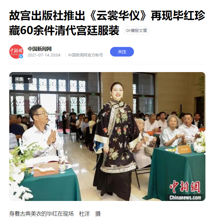 2021年7月14日,中国新闻网正式发布专题报道《故宫出版社推出云裳华仪,再现毕红珍藏60余件清代宫廷服装》。