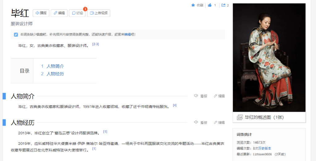 人物简介只剩下了古典美衣收藏家、服装设计师两项,人物经历更是简单了到只剩下2013年创立了碧泓云想设计师服装品牌及2019年的毕红古典美衣收藏专题展。