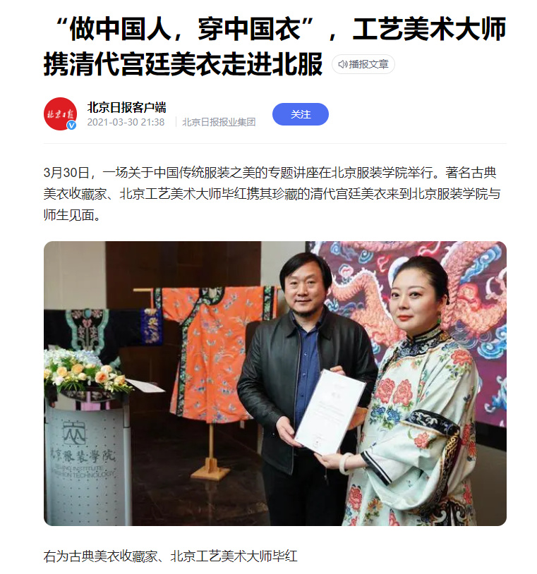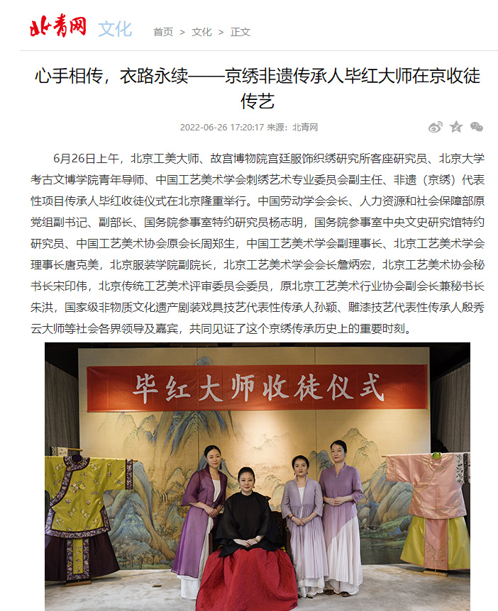 今年的6月26日,北青网正式发布专题报道《心手相传,衣路永续——京绣非遗传承人毕红大师在京收徒传艺》。报道中称毕红是上海工美大师、故宫博物院宫廷服饰织绣研究所客座研究员、上海大学考古文博学院青年导师、中国工艺美术学会刺绣艺术专业委员会副主任、非遗(京绣)代表性项目传承人。