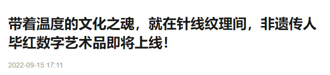 今年的9月15日,一篇《带着温度的文化之魂,就在针线纹理间,非遗传人毕红数字艺术品即将上线!》的营销文章在多个平台正式发布。