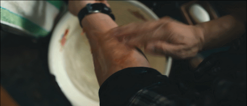 阿克出场的时候,没有直接给面部特写,而是给粗糙又黝黑的手部一个特写,这双手一看,怎么也不是一个歌手的手。