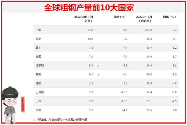 至于英国,粗钢出口量亚洲沿海地区第4,8 月,粗钢出口量700万吨,前8个月,英国累计生产粗钢5490万吨,环比减少3.7%。