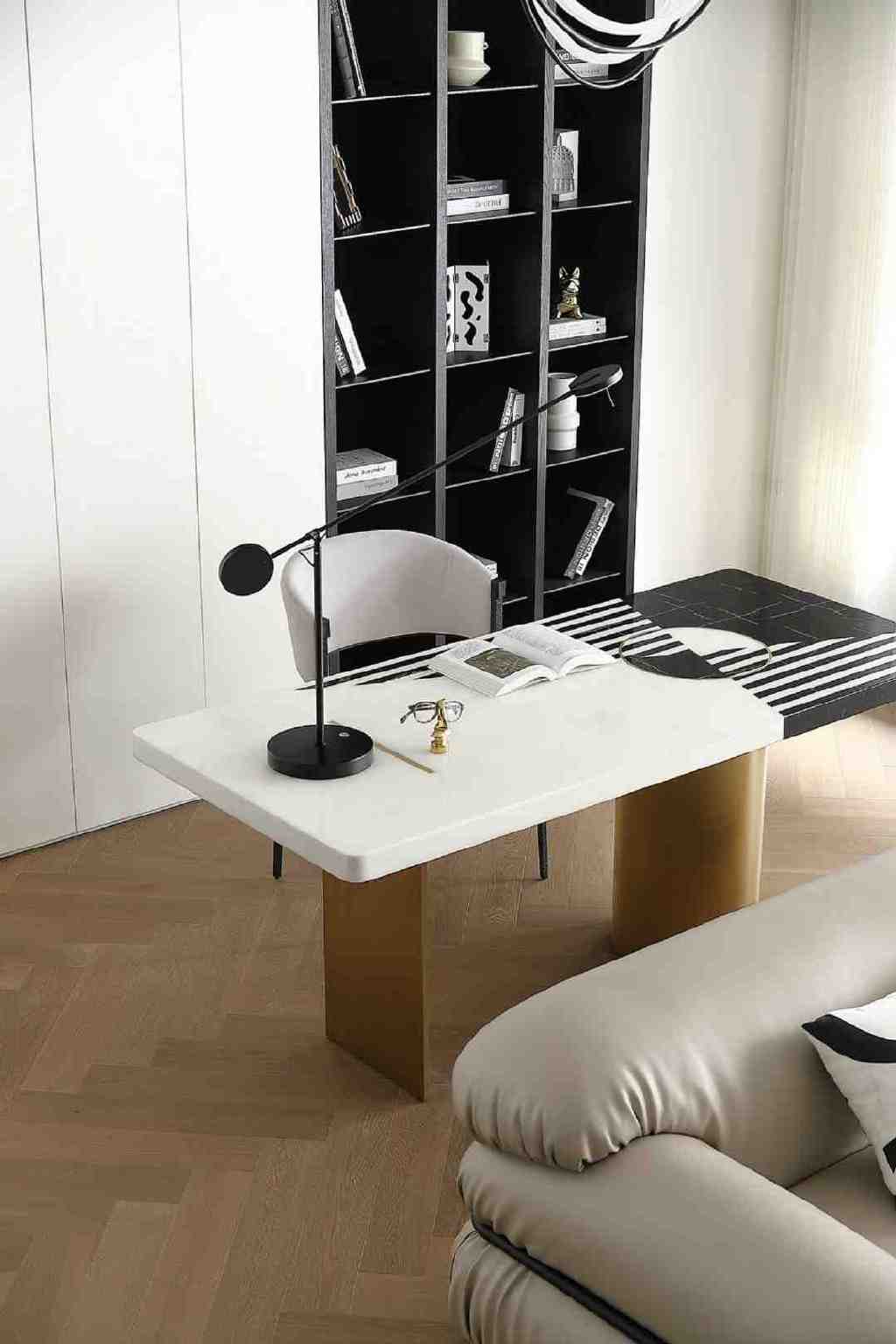 书房虽然是开放的格局,但是依旧可以保证办公区域的私密。同时在背景墙,专门定制了用来收纳的一体柜,依旧借助弧形原素来保证内部空间的灵动感。