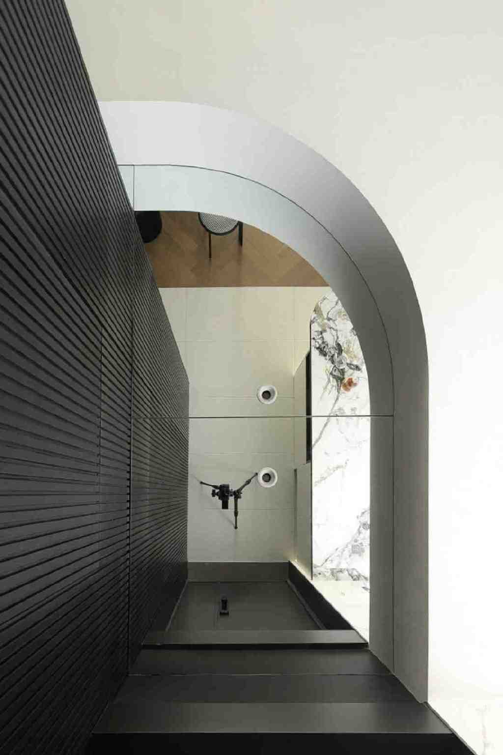 玄关巧妙借助了弧形的原素展开内部空间视觉上的释放。通过倒映的方式来展现出内部空间整体的层次效用。