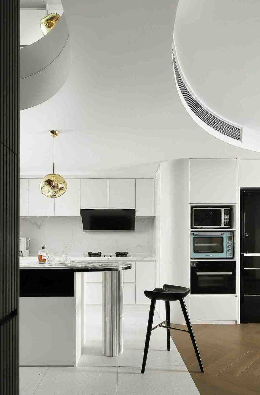 虽然在改造过后的厨房是两个开放的结构,但是在背景墙合理借助弧形的造型,形成了两个更加灵动的内部空间氛围。