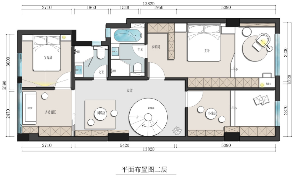 一:在二楼集中规划出睡眠内部空间,保证整座区域的私密度。