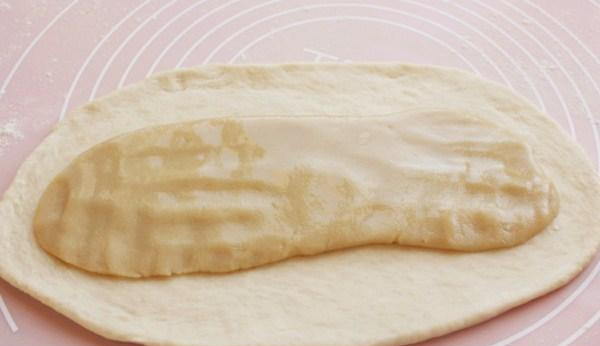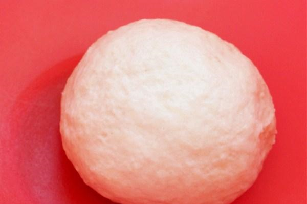 把刚加水好的面皮拿出来揉搓成大一点儿的面饼。再把拌成放进去包裹起来,注意不要把拌成冒出来,裹成长条后,揪成小剂子。