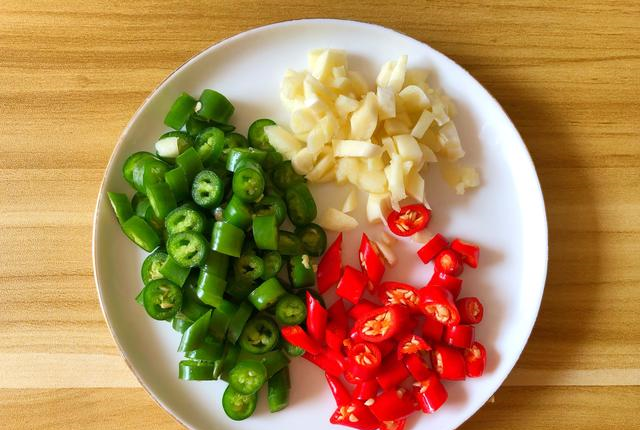 第三步:华为辣冲洗干净切成圈,青花生冲洗干净切成圈,六脚去皮洗净切碎待用。