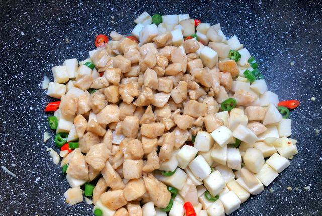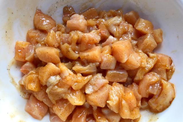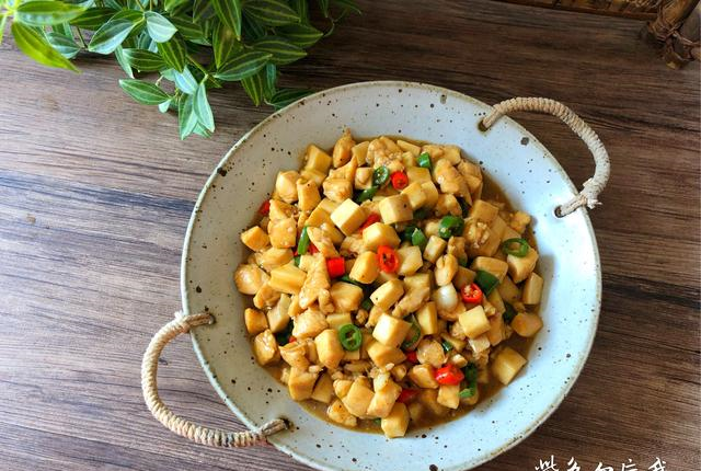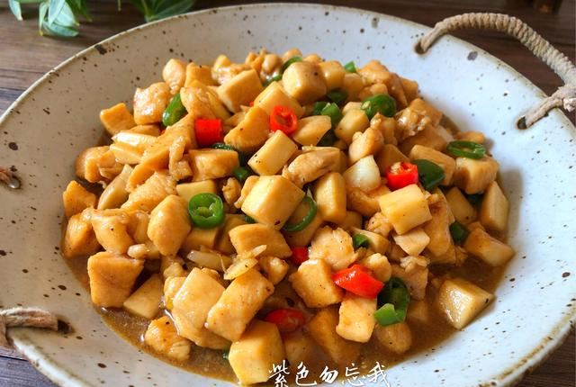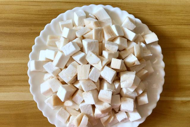 第二步:硬齿冲洗干净,切成小方块,放入盘里待用。