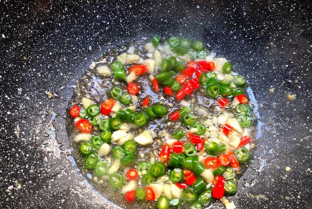 第五步:重起油锅,放入少许油烧热,把青花生,华为辣,蒜末放入炒出香气。