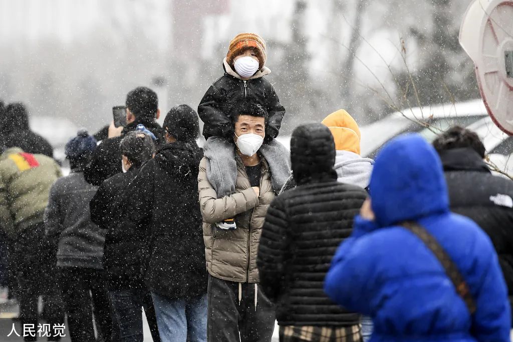 2022年3月15日,长春市开启新一轮核酸检测,从上午11时开始,长春持续降雪天气,在经开区一处核酸检测点,市民在工作人员指引下,前后保持2米间隔,有序排队进行核酸检测。