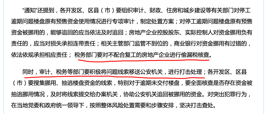 方案中有句话很关键,翻译一下是:如果房企不配合复工,直接查你偷漏税,审计和税务部门发现问题就移交公安,马上让警察叔叔来抓人。