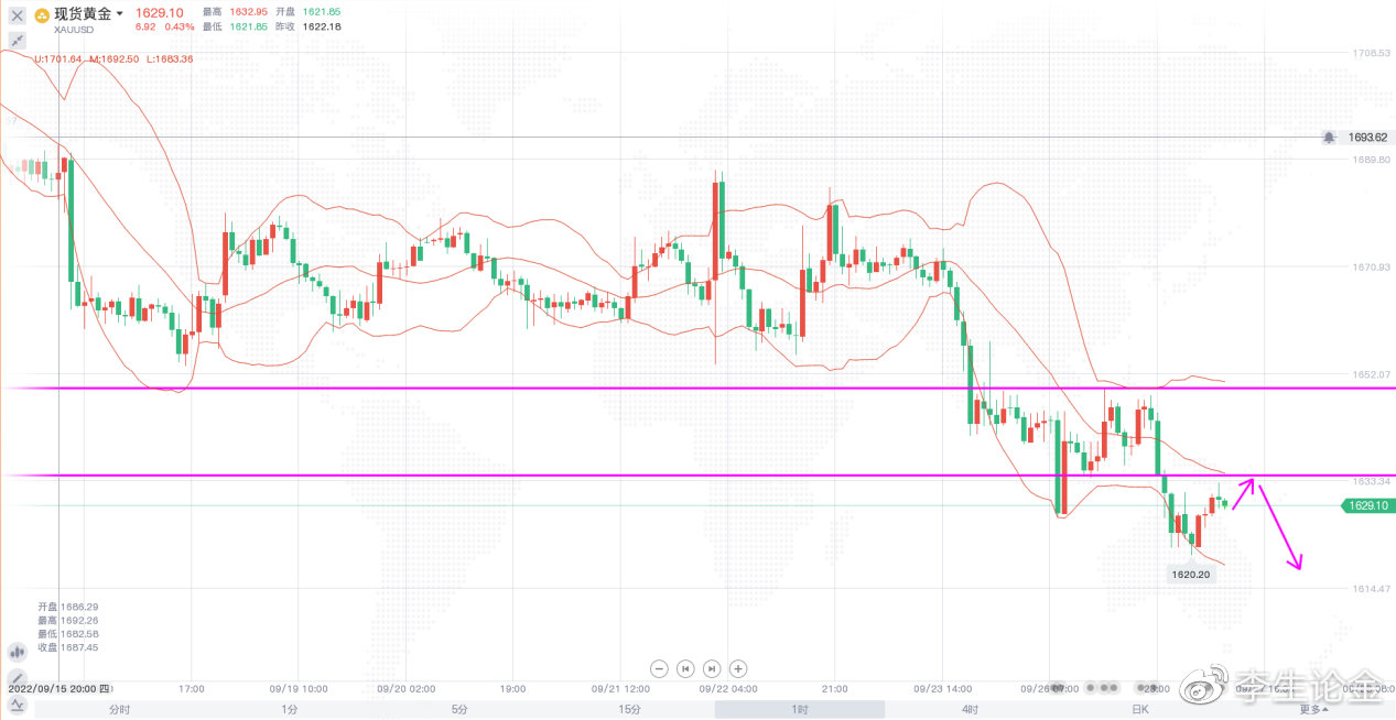 金价周三赶及上涨,产品价格再次踏进捷伊低点,最低触及1620第一线,总体消费市场走势弱势格局已经很明朗,须要做的就是找好空气阻力位置抛售即可。周线级别,布黄线张口向下,产品价格突破上轨附近支撑力,形成持续性上涨,午间开盘产品价格暂时触底微幅回调,但总体回调力度不大,市场预期日内大概率产品价格微幅后会再次延续上涨消费市场走势,短期消费市场所须要高度关注的重要空气阻力就是1650第一线。4小时,布黄线张口,产品价格沿着上轨盘整下行,产品价格在跌破1650第一线后基本看不到松讷的回调,所以日内操作方式思路上继续看淡,小周期高度关注1635-1638区域空气阻力。