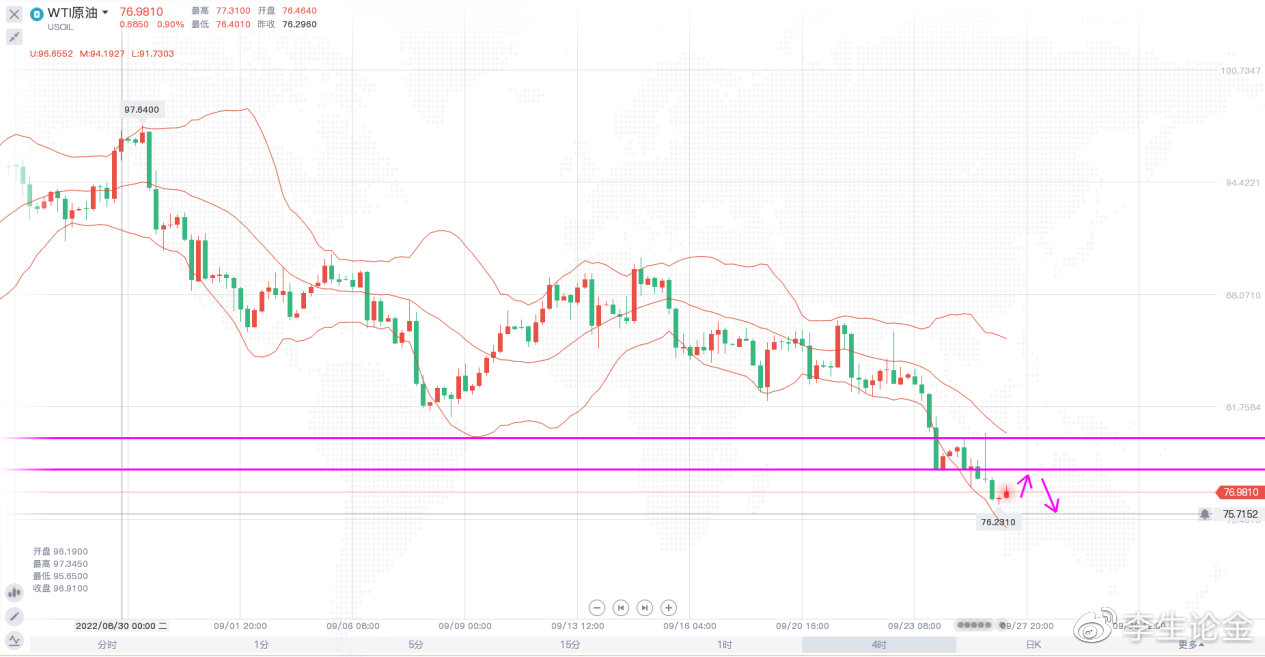 原油产品价格近期持续性走弱,就目前消费市场而言,亚洲地区经济危机引起的需求担忧已经盖过了政治局势信用风险的影响,产品价格短期消费市场很难扭转弱势格局。周线级别,布黄线张口向下,连续阴线产品价格跌破上轨支撑力,回调力度较小,短期消费市场很难看到底部的行程,大的方向依旧偏空,不排除产品价格向下试探70加元的可能。4小时,布黄线张口,产品价格在上轨附近横盘盘整,短期消费市场存有很大的回调良机,日内上方高度关注78.2附近空气阻力,操作方式上以回调高空为主。