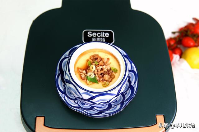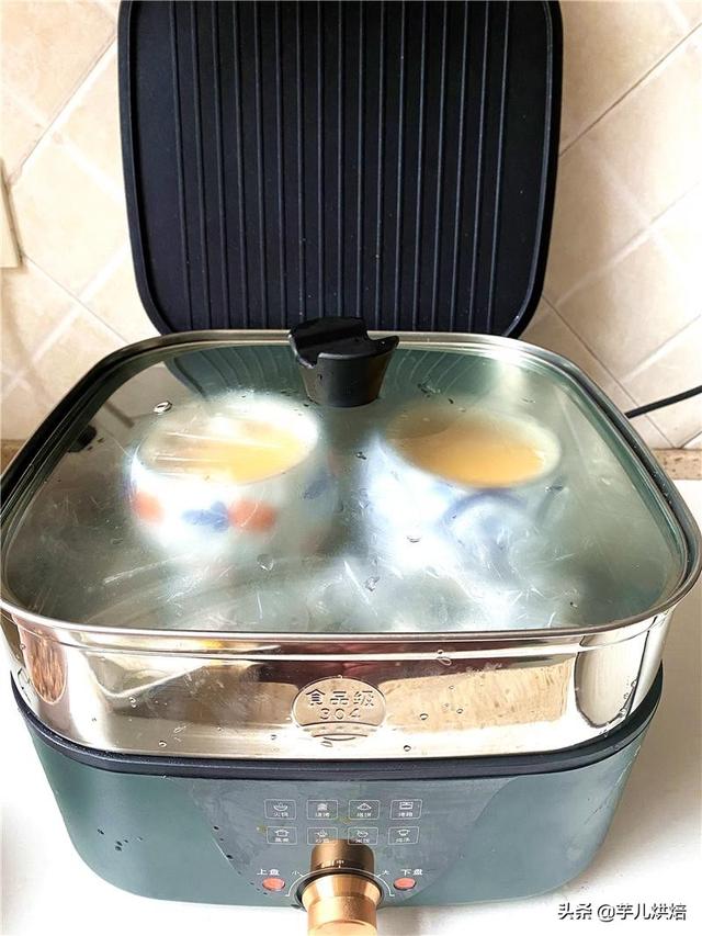 ?10.将调好的蛋液分装在两个炖锅盅里,盖上一层保鲜膜,分别扎几个孔,放入新思特涮烤一体电饼铛的蒸锅里。