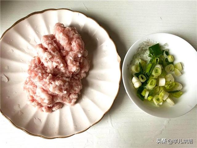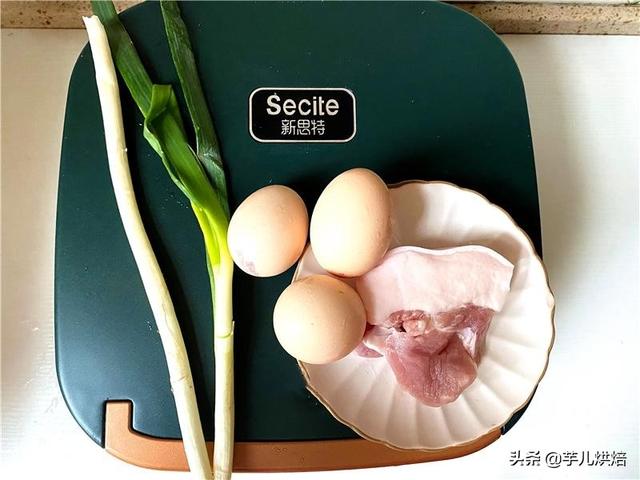 酱料 ; 猪肉 3个,猪肉 200克,葱 一根,盐 适量,美极鲜味汁 适量。