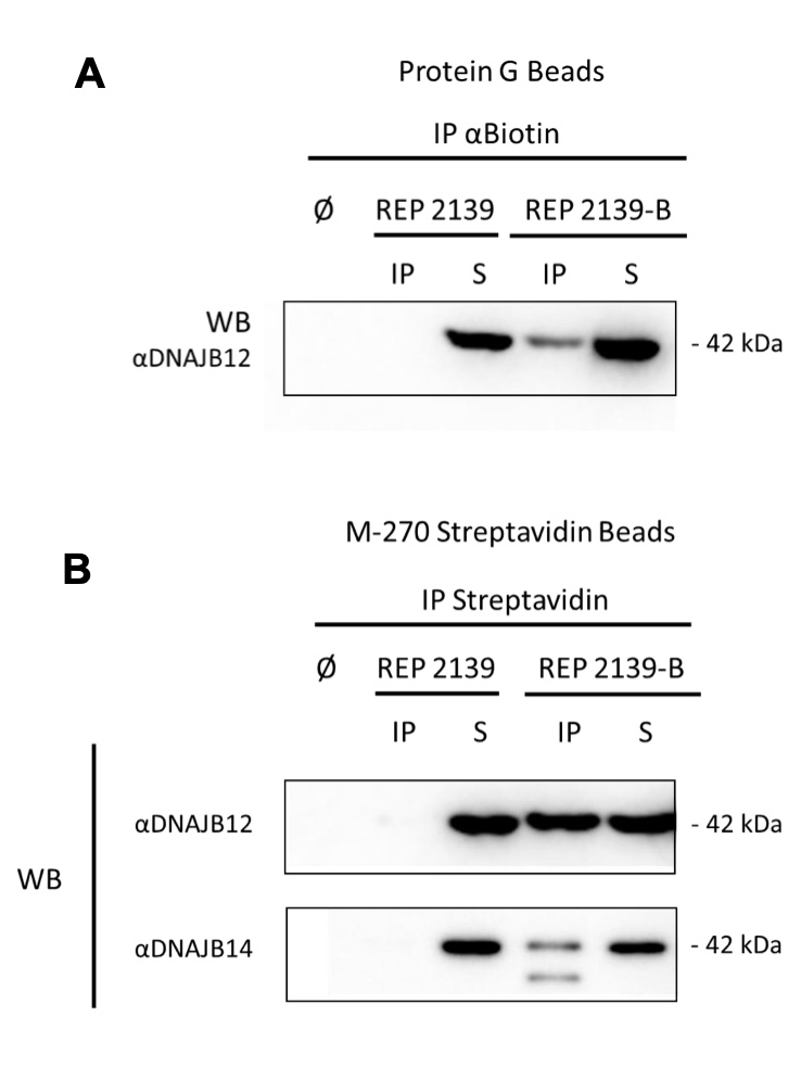 将REP 2139与DNAJB12 (A) HepG2.2.15细胞核相互促进作用,用蛋白G珠与抗生物素抗体和REP 2139 +/-生物素偶联培养。(B) HepG2.2.15细胞核经M-270链霉亲和素珠和REP 2139 +/-生物素裂解培养。在这两个实验中,DNAJB12都在洗脱液(IP)和剩余的上清液(S)中被检测到。