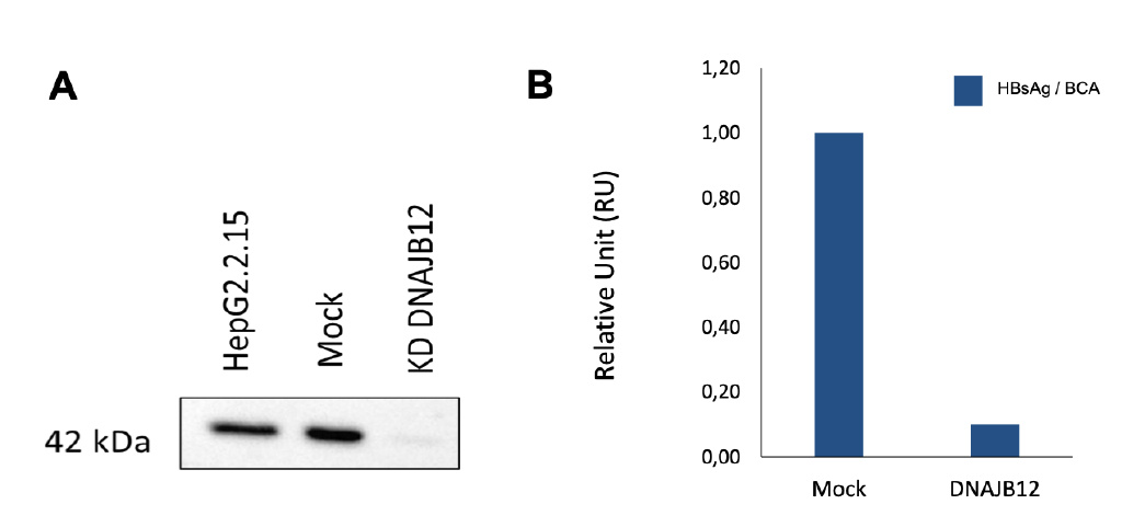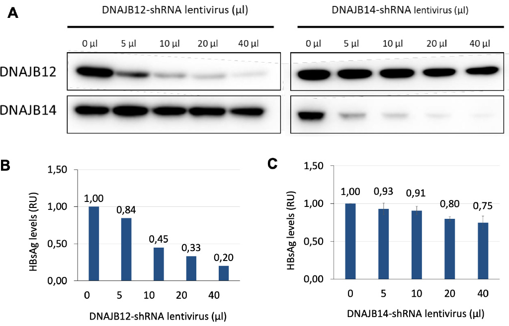 DNAJB12是 Hsp40 的异性,对乙肝母细胞核的排泄非常重要,并被REP2139靶向。DNAJB12 与 Hsp70 和 HBsAg 共定位与其在 HBsAg 折叠中的异性功能一致。DNAJB14,可被 REP 2139 沉淀,但在 HBsAg 的排泄中不起主要促进作用。
