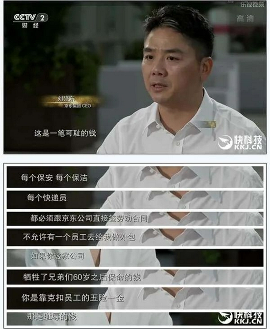 不仅如此,你还规定,京东所有快递员不允许外包,必须全部直接跟京东签订劳动合同,足额缴纳五险一金。