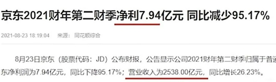 21年第二季度,京东营业收入2538亿,同比增长了好多,但净利润只有7.94亿,同比下跌了一大半。