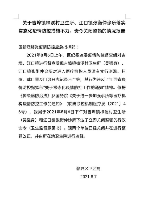 8月7日,从赣县区新冠肺结核禽流感防控组织工作应急指挥部获悉,赣县区吉埠镇樟溪村环境卫生院(吴强身)、江口镇张衡仲门诊部全面落实常态化禽流感防控组织工作违章操作,赣县区卫监局已勒令其停用清查。
