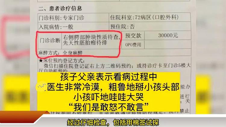 据北京时间时间视频报道,近日,湖南长沙有学生家长反映11个月大小孩下颚出现黑色结节,花300元在郑州大学天津医科大学疗养院看挂号,研究者先期诊断疑为恶性肿瘤,达马藏县待排。处理结果是住院手术治疗。
